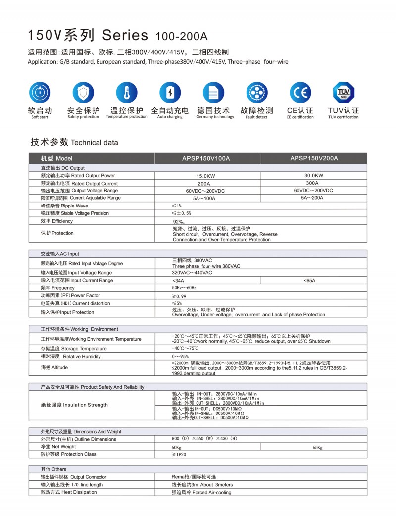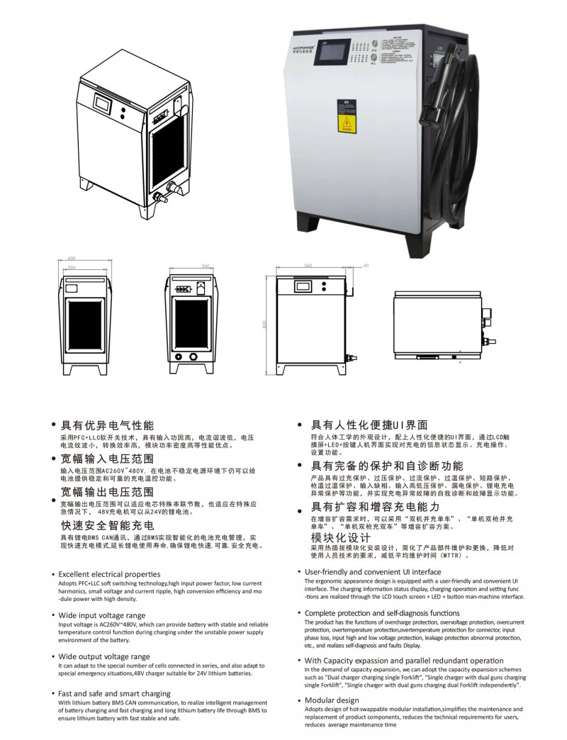 觸摸屏智能操作設(shè)計(jì):告別傳統(tǒng)按鍵方式,給您帶來(lái)更現(xiàn)代更具科技智能的操作體驗(yàn) 自動(dòng)充電:插槍自動(dòng)充電,簡(jiǎn)化充電流程,便于操作 兼容性高:80V200A兼容48V200A充電 多重保護(hù): 輸出短路,過(guò)流過(guò)壓保護(hù),反接保護(hù),電流導(dǎo)管保護(hù)等多重保護(hù) 預(yù)約充電功能:避開高峰用電時(shí)段,有效節(jié)省成本 雙語(yǔ)切換:中英文雙語(yǔ)隨需切換,跨越語(yǔ)言障礙,與世界接軌 人性化設(shè)計(jì):充電機(jī)背板內(nèi)部附部件明細(xì)及產(chǎn)品接線圖,方便客戶可更清楚的了解產(chǎn)品,便于維修,提高售后時(shí)效 獨(dú)特設(shè)計(jì): 內(nèi)置電磁鎖驅(qū)動(dòng)模塊,防止臨時(shí)斷電鎖槍 使用壽命更長(zhǎng):功率模塊預(yù)留20%空間,提高模塊的使用壽命 出色內(nèi)部結(jié)構(gòu): 內(nèi)部結(jié)構(gòu)左右出風(fēng),內(nèi)部電路不容易積粉塵,提高充電機(jī)壽命