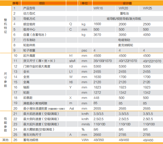 麥克納姆輪全方位任意移動;雙液壓缸前移機構門架前移更加穩定可靠;搖擺式轉向橋,克服地面坑洼不平帶來的影響;搭載激光導航、磁導航、視覺導航等系統, 實現智能無人化;手動遙控實現定位精度達到±0.5mm; 個性化定制起升重量以及堆垛高度;可選裝叉車常用屬具,工作范圍更廣;根據客戶要求,可選配鉛酸蓄電池或鋰電池;