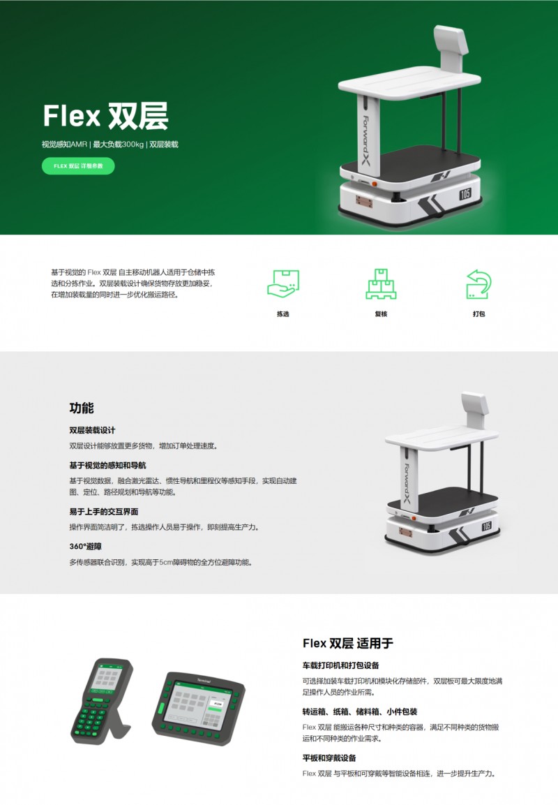 基于視覺的 Flex 雙層 自主移動機器人適用于倉儲中揀選和分揀作業(yè)。雙層裝載設(shè)計確保貨物存放更加穩(wěn)妥,在增加裝載量的同時進一步優(yōu)化搬運路徑。
