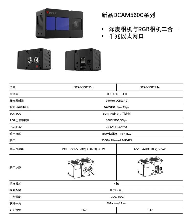 DCAM560C產(chǎn)品系列集成了團(tuán)隊(duì)近年來的研究成果,將2D RGB圖像與3D ToF面陣相機(jī)技術(shù)相結(jié)合,輸出在時(shí)間和空間上重合的RGB和3D圖像,每個(gè)像素都參與測距,不僅可以在獲取XY軸方向圖像的基礎(chǔ)上還能獲取Z軸方向上的距離信息,從而獲得高精度的深度圖,實(shí)現(xiàn)“三次元空間的感知能力”,用以滿足工業(yè)級(jí)客戶不同的使用場景,適用于工業(yè)自動(dòng)化,智能物流,智慧駕駛,智能安防,3D建模等需要3D感知物體與環(huán)境、構(gòu)建3D模型并進(jìn)行分析的領(lǐng)域。