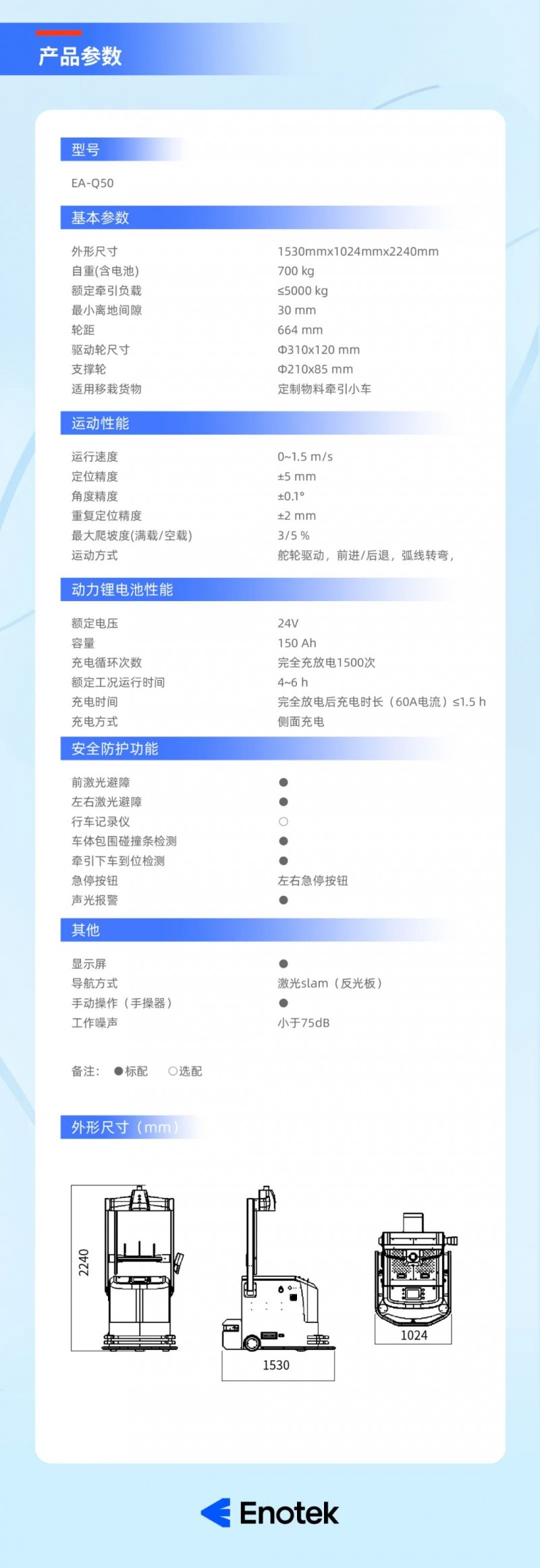 牽引式AGV EA-Q50詳細(xì)參數(shù),請(qǐng)參見以下參數(shù)表: