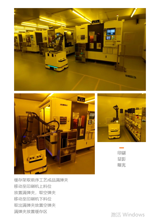 優艾智合應用彈夾轉運機器人,在黃光一體化車間“印刷-顯影-曝光”工藝流程間的自動上下料、空籃回收、緩存管理作業。