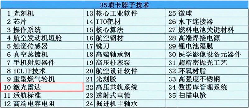 2018年《科技日報》總結(jié)了制約我國工業(yè)發(fā)展的35項“卡脖子”技術(shù),其中第十項是激光雷達技術(shù)。