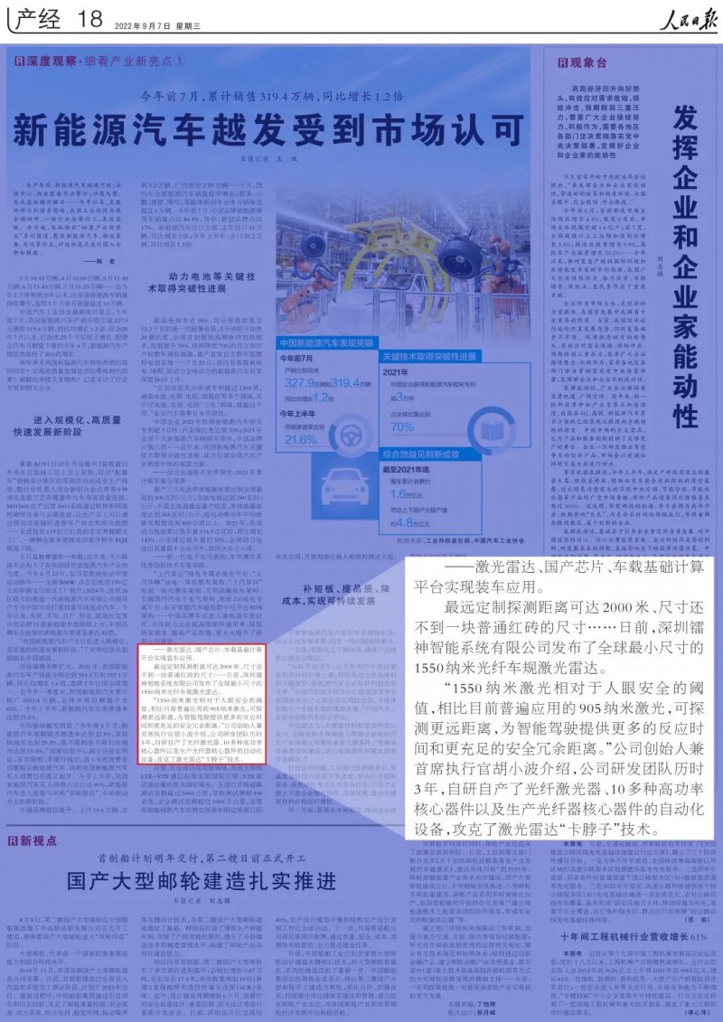 2022年9月7日,人民日報刊登了一篇名為《新能源汽車越發(fā)受到市場認可》的文章,其中介紹了鐳神智能創(chuàng)始人胡小波帶領(lǐng)團隊攻克了我國被“卡脖子”的激光雷達技術(shù)問題。