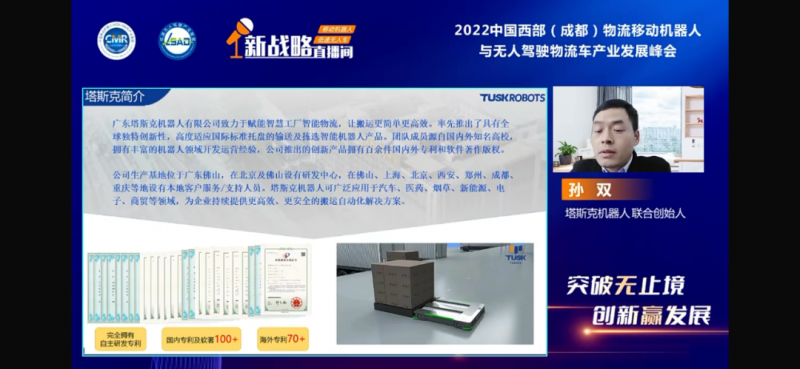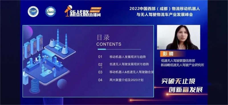 11月23日,由中國移動機器人(AGV/AMR)產(chǎn)業(yè)聯(lián)盟、低速無人駕駛產(chǎn)業(yè)聯(lián)盟、《物流搬運機器人》雜志社、《低速無人車》雜志社、成都北辰中金展覽有限公司聯(lián)合主辦,新戰(zhàn)略移動機器人全媒體、 新戰(zhàn)略低速無人駕駛?cè)襟w協(xié)辦的2022中國西部(成都)物流移動機器人與無人駕駛物流車發(fā)展峰會在線上成功舉行!