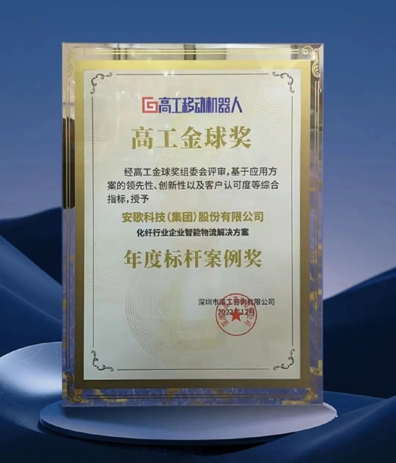 2022年12月安歌科技的化纖解決方案憑借優(yōu)秀的團隊配合度、創(chuàng)新的技術、杰出的集成能力,以及自研自產的硬件+軟件+系統+服務的創(chuàng)新集成模式,榮膺2022化纖行業(yè)企業(yè)智能物流解決方案 年度標桿案例獎。