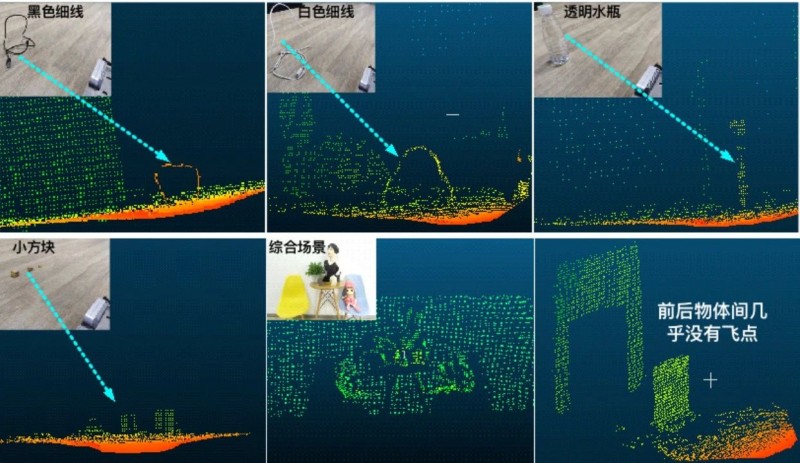 實拍場景與3D點云,可以看到dToF不僅在綜合場景中表現(xiàn)優(yōu)秀,對小物體,細線甚至透明物體等極端場景都有非常好的表現(xiàn),并且相對于其他ToF技術(shù),dToF在飛點(前后物體邊界難以區(qū)分造成的)的表現(xiàn)上有天然優(yōu)勢。