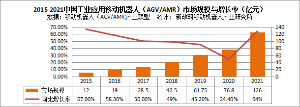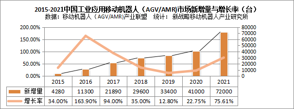 2015-2021中國市場企業(yè)工業(yè)應(yīng)用移動(dòng)機(jī)器人(AGV/AMR)新增量(臺(tái))與增長率
