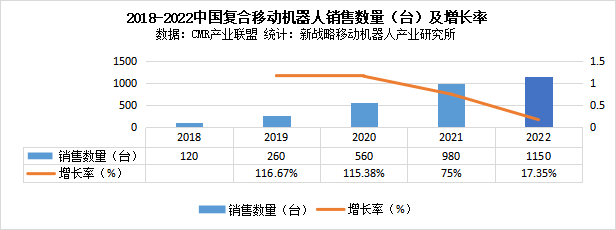 根據CMR產業聯盟數據,新戰略移動機器人產業研究所統計, 2022年度中國市場新增復合移動機器人1150臺,同比增長17.35%。2022年,復合移動機器人增速下降,主要原因在于其應用的主要市場3C電子、半導體等產業處于下行周期,市場需求放緩。