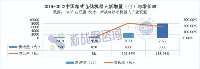 經過近幾年的市場培育,箱式倉儲機器人應用不斷深入。根據CMR產業聯盟數據,新戰略移動機器人產業研究所統計,2022年度中國市場新增箱式倉儲機器人約8000臺,較2021年增長188.96%。