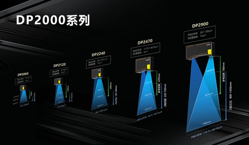 海康機(jī)器人3D激光輪廓傳感器目前已發(fā)布DP2000和DP3000兩大系列。其中DP2000推出五款型號,單輪廓點數(shù)為2048點,最高采集頻率達(dá)到10KHz,X軸測量范圍25.2-720mm,Z軸重復(fù)精度0.4-24um,線性度±0.01% of MR,且DP2240和DP2470支持紅藍(lán)光兩個版本選配。