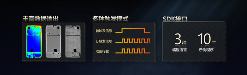 相機(jī)對外提供豐富的數(shù)據(jù)接口,包括輪廓數(shù)據(jù)、點云數(shù)據(jù)、深度圖、亮度圖。同時兼容多種觸發(fā)模式,支持差分編碼器觸發(fā)輸入,支行觸發(fā)、幀觸發(fā),行+幀觸發(fā)的應(yīng)用模式。通過SDK集成激光輪廓傳感器到第三方軟件框架,提供C、C#、Python三種語言版本的SDK,包括主流視覺分析軟件在內(nèi)的10多種集成使用示例,便于用戶的二次開發(fā)。