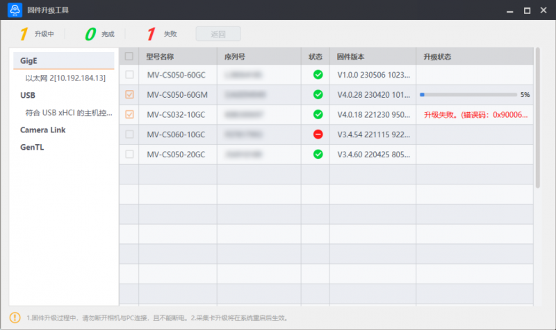工具可批量升級多個(gè)相機(jī)或采集卡固件,最多可同時(shí)勾選20個(gè)相機(jī)或采集卡。