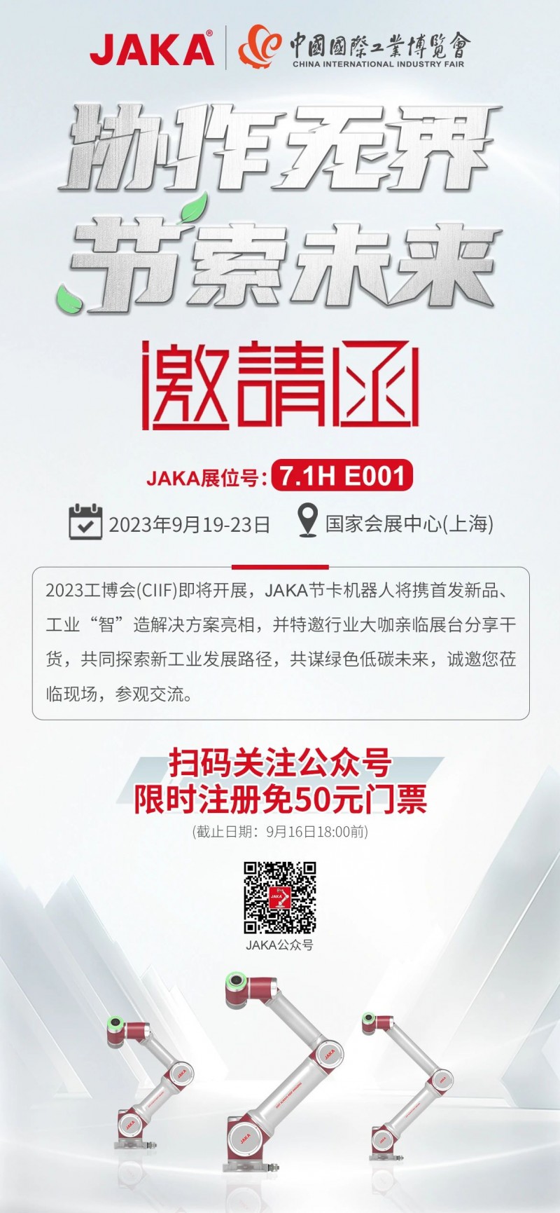 掃描下圖中二維碼,關注節卡機器人公眾號,限時注冊還可免50元參展門票。