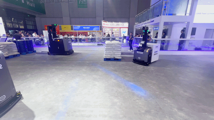 兩款今年新上市的智能叉車 SFL-CBD15 和 SFL-CDD16 在同一展區(qū)內(nèi)協(xié)同作業(yè),互為運(yùn)行障礙物。兩車在保持最快 2m/s 的運(yùn)行速度下依舊完美多次避讓,在避障激光、3D 避障相機(jī)、距離傳感器等多種傳感器的保護(hù)下實(shí)現(xiàn)高速暢行,順滑過(guò)彎,精準(zhǔn)避障,靈活繞行。