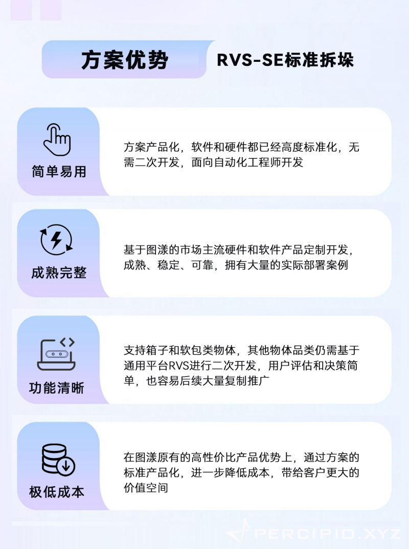 圖漾科技發布RVS-SE(RVS Standard Edition),面向拆垛類應用提供完整的3D視覺方案標準產品,可與主流工業機器人配合,無需二次開發即可輕松完成拆垛工作站的實施與交付。