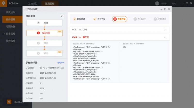 在AMR核心任務(wù)處理單元中,可呈現(xiàn)全鏈路任務(wù)流轉(zhuǎn)圖,將任務(wù)從下發(fā)到完成的所有交互信息直觀展示,讓現(xiàn)場實(shí)施交付更高效,可用于工廠物流場景中的儲(chǔ)位管理、任務(wù)管理、貨架/容器管理等場景。