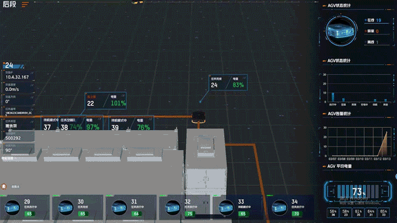 在某流通應用場景中,海康機器人的數字孿生平臺采用先進的“一屏多顯”技術,能夠在一個界面上同時展示多個外部系統的統計數據,用戶能夠迅速獲取并分析關鍵數據,從而更好地監管生產線的運行狀態,確保生產過程的高效和順暢。