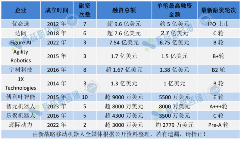 Agility Robotics、宇樹科技、1X Technologies、傅利葉智能、智元機器人、樂聚機器人和逐際動力等企業(yè)分列其后。其中,Agility Robotics、宇樹科技、1X Technologies總?cè)谫Y金額均已破1億美元,傅利葉智能也逐漸逼近這一門檻。