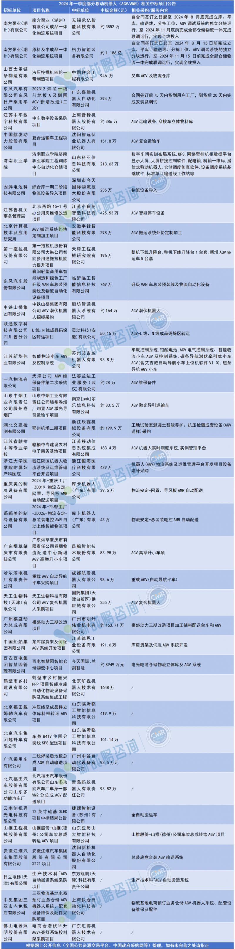 其中,一季度移動機器人領域公開發布超50項中標公告。從移動機器人領域的中標項目分布情況來看,一季度中標公告主要集中于汽車行業及工程機械行業。另據新戰略移動機器人產業研究所統計,汽車行業在2024年一季度釋放超十億元標的。其次是物流倉儲業。此外,醫療衛生、電子等行業也有較多招標項目。