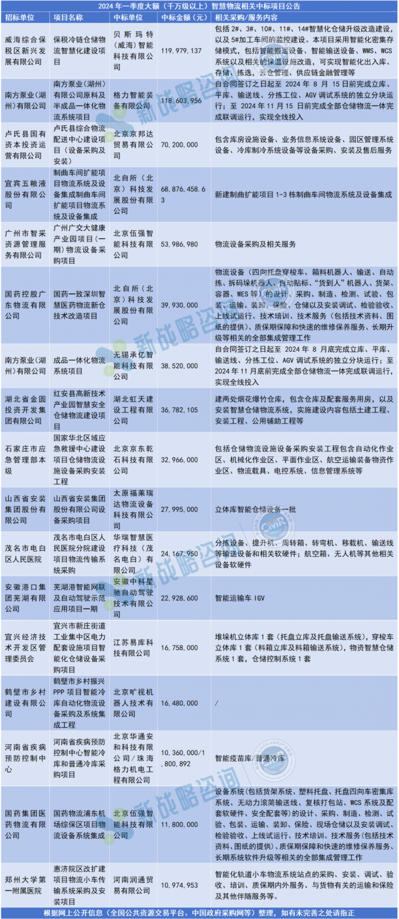 根據公開信息,新戰略移動機器人產業研究所不完全統計,2024年第一季度,國內智慧物流領域發布超200項中標公告。從中標公告的項目體量分布來看,千萬級以上的大額中標項目超過17個,億元級以上的中標項目2個。各行各業對自動化及智能化物流倉儲解決方案的需求持續存在。