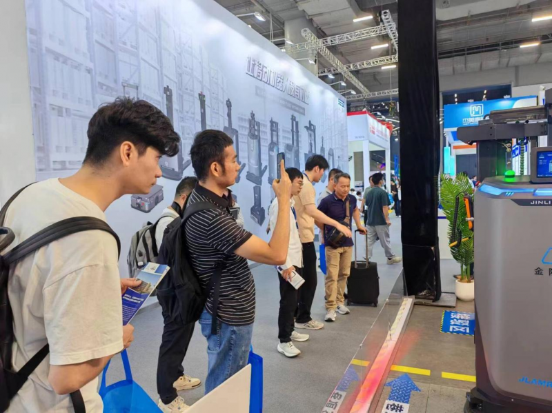 展會(huì)現(xiàn)場,JLAMRF-014-S(O)叉式AMR在WMS智慧倉庫管理系統(tǒng)、RCS智能機(jī)器人調(diào)度管理系統(tǒng)的調(diào)度下完成,從接駁區(qū)叉取托盤貨物,在1800mm的巷道內(nèi),轉(zhuǎn)運(yùn)至二層貨架,同時(shí)展示了自旋、橫移、自適應(yīng)叉取托盤時(shí)一步叉取到位等多項(xiàng)動(dòng)作,吸引眾多觀眾駐足觀看、咨詢。
