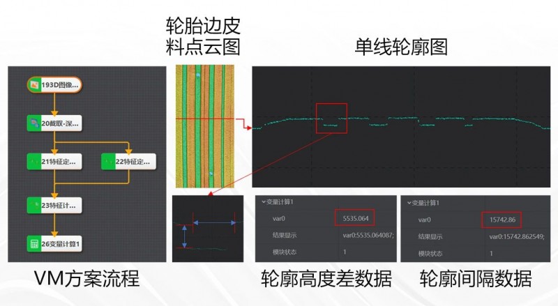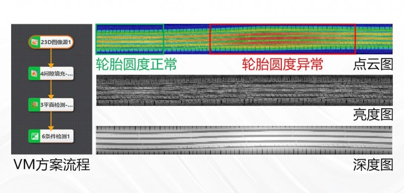 通過3D激光輪廓傳感器掃描輪胎正面、VM搭建方案實(shí)時(shí)測量輪胎單點(diǎn)高度值變化,當(dāng)高度值變化低于一定的閾值時(shí),認(rèn)為輪胎是圓形的,當(dāng)高度值變化高于一定的閾值時(shí),認(rèn)為輪胎不圓,此時(shí)剔除不良品。