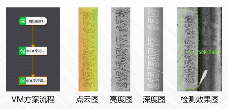 采用3D激光輪廓傳感器進(jìn)行圖像采集,結(jié)合海康機(jī)器人AI訓(xùn)練平臺,進(jìn)行字符識別,可準(zhǔn)確識別輪胎所有DOT碼。