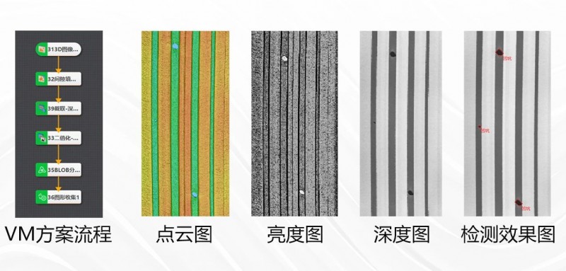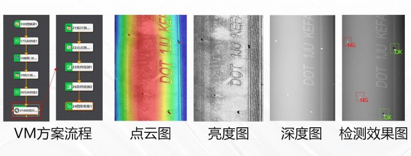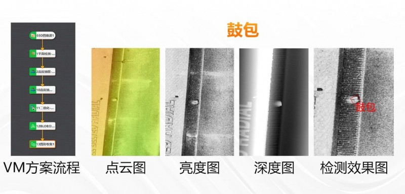 下圖展示了3D激光輪廓傳感器對輪胎胎毛的實(shí)際采集效果及VM檢測方案。