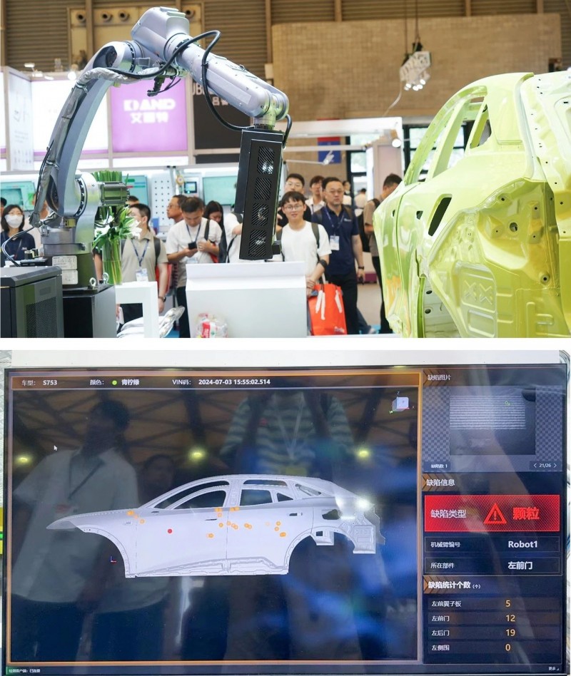 采用海康機(jī)器人自研的程控條紋光傳感器進(jìn)行采圖,對車漆表面的顆粒,漆疤、劃痕、氣泡、針眼等缺陷進(jìn)行在線全檢,最小可實(shí)現(xiàn)0.2mm的缺陷檢測,借助機(jī)械臂的柔性,檢測可達(dá)性區(qū)域幾乎覆蓋100%車身。