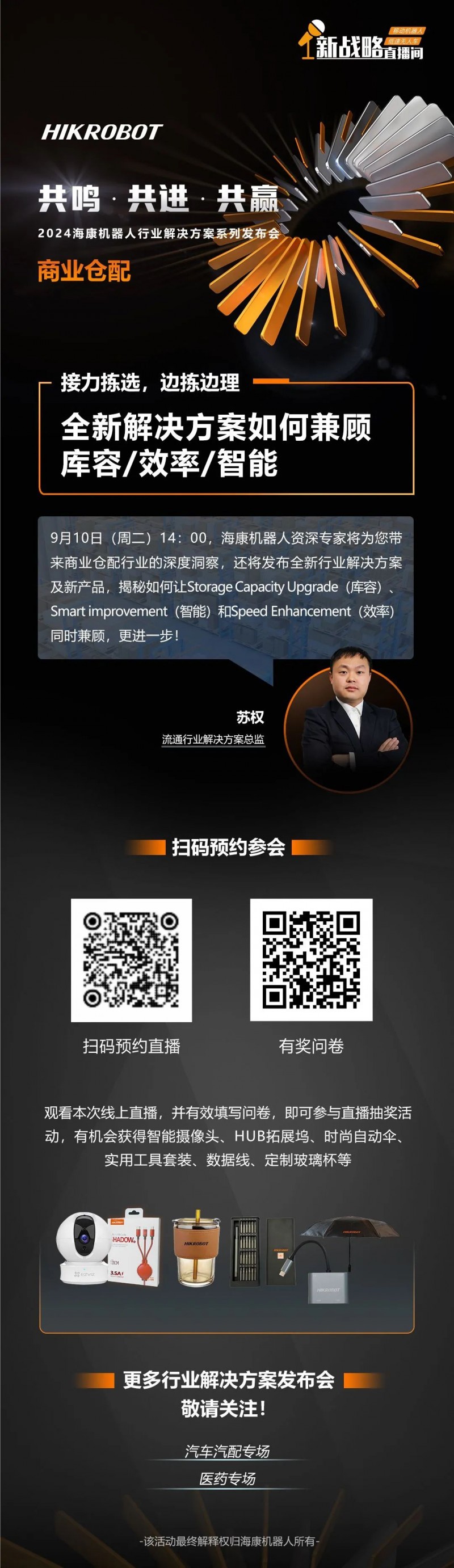 9月10日(周二)14:00,海康機器人資深專家將帶來商業(yè)倉配行業(yè)的深度洞察與技術分享,同時發(fā)布全新行業(yè)解決方案和新產品,揭秘新方案如何做到任務解耦,接力揀選,同時突破揀、理貨無法并行的挑戰(zhàn),做到邊揀邊理,讓