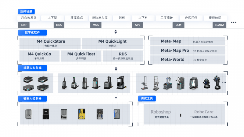 M4智能物流管理系統(tǒng)集合了機(jī)器人、任務(wù)管理、物料管理,解決方案主要聚焦四大應(yīng)用場(chǎng)景:多車(chē)調(diào)度但不需要倉(cāng)儲(chǔ)管理、單車(chē)調(diào)度無(wú)交管、倉(cāng)配一體化和光通訊場(chǎng)景。M4 系統(tǒng)不僅做到了All in One,并且降低了向上向下對(duì)接的門(mén)檻,可以無(wú)縫融入客戶業(yè)務(wù)系統(tǒng),向下可集中管理工廠內(nèi)智能化設(shè)備作業(yè)。