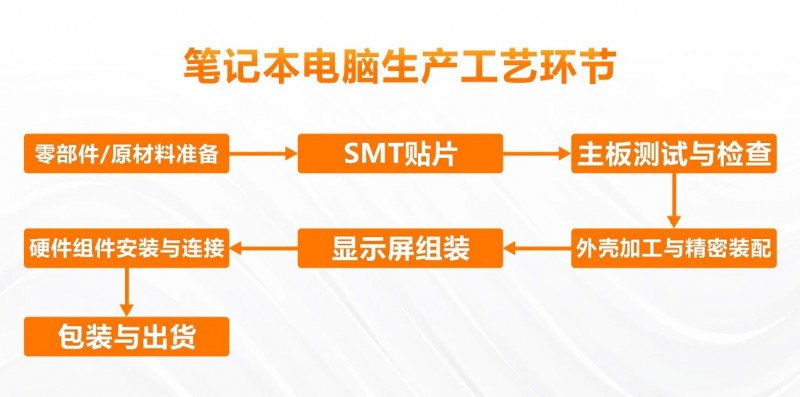 在零部件及原材料準備環(huán)節(jié)中,需要準備好相關組件:如主板、顯示屏、鍵盤、電池、外殼和內(nèi)部結構件等,這些元器件通常由不同的供應商提供。