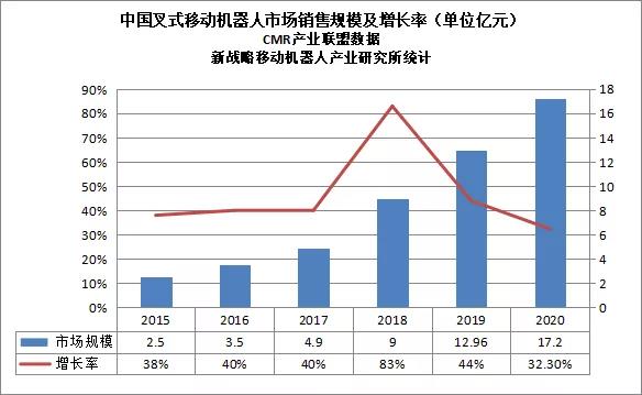 圖表1:2015-2020中國叉式移動(dòng)機(jī)器人市場銷售規(guī)模及增長率(單位億元)