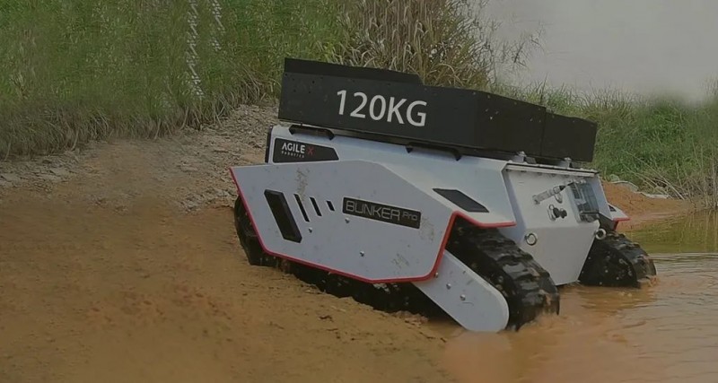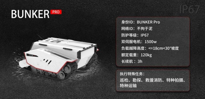 為滿足客戶拓展全行業領域應用開發的需求,松靈機器人全新發布了一款加強型越野履帶式移動底盤開發平臺BUNKER Pro,它采用了多懸掛組合設計,并于全車安裝了加強版避震器組合,結合獨特的防撞擊結構設計,極大減少了復雜地形沖擊,使其輕松滿足重載、防震、越野等要求;同時,BUNKER Pro全新的封閉式箱體、高防水等級的對外通訊和供電接口等設計,使整車的防護等級達到IP67,這將給機器人帶來全新的應用場景和使用體驗。 可以說,BUNKER Pro提供了在野外、箱涵、石泥路等高挑戰性環境下最佳的移動開發平臺,助力機器人行業和科研客戶快速部署和開發特殊作業機器人,諸如巡檢、勘探、消防、特種拍攝、特種運輸等應用。BUNKER Pro外觀結構全新設計,車身重心位置低,裝置了1500W雙伺服電機進行驅動,極具越野性。此外,其采用了克里斯蒂懸掛和瑪蒂爾達四輪平衡多懸掛系統組合,并于全車安裝了加強版避震器和防撞擊結構組件,外觀采用了高強度和大厚度的鋼材,這為執行特種作業應用提供了可靠的減震系統性能。  目前,BUNKER Pro最高越障可達18cm,爬坡度為<=30°,這意味著面對野外坡道和廠區樓梯,BUNKER Pro都可以一舉輕松爬越和穩定運行。BUNKER Pro驅動形式為履帶差速轉向和左右獨立驅動,自研運動控制系統電機采用了2500線光電增量式碼盤,可以在復雜道路中實現高精度的控制,并且可以柔性實現0轉彎半徑原地自旋。BUNKER Pro外觀配置了防撞耐用的鋼質結構, 且整車結構、材料以及外置電氣元件均采用均采用高防護等級設計,達到了IP67安全標準,這是市面上同級別綜合路況移動平臺中防護等級最高的。其具備沙塵滲透防護、移動涉水和短暫浸泡防護(防浸)等優勢,無懼任何潮濕、涉水、越野等極限工作環境,可以保證BUNER Pro極大拓展機器人的使用場景。基于高等級防護、模塊化和精簡部件結構設計,BUNKER Pro車體后期清潔也是十分便捷的,不藏污垢,不易腐蝕,易于維護。BUNKER Pro平臺空間大,可以在原地自旋過程中達到120kg載重,這意味著可以輕松搭載各類檢測設備。用戶可通過CAN總線協議與主控通訊,快速接入傳感系統,搭建自主應用開發平臺,同時,BUNKER Pro也支持定制高級操作模式(遠程駕駛/自動駕駛),提供開源SDK、ROS_PACKAGE。BUNKER Pro還具有大電池容量,可在常規路面載重120kg運行情況下支持3小時續航, 也可對搭載的傳感器等外部設備進行供電, 為機器人應用的作業提供充足和便捷的運行保障。