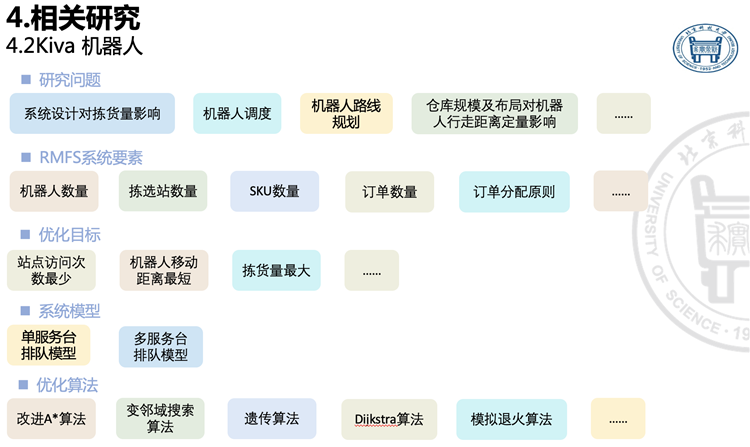 此外,趙寧教授介紹到,真正的物流仿真還涉及很多方面:如系統(tǒng)設(shè)計對揀貨量影響、機器人調(diào)度、機器人路線規(guī)劃、倉庫規(guī)模及布局對機器人行走距離定量影響;RMFS系統(tǒng)要素如機器人數(shù)量、揀選站數(shù)量、SKU數(shù)量、訂單數(shù)量、訂單分配原則;優(yōu)化目標(biāo)如站點訪問次數(shù)最少、機器人移動距離最短、揀貨量最大;系統(tǒng)模型單服務(wù)臺排隊模型、多服務(wù)合排隊模型;優(yōu)化算法如改進A*算法、變鄰域搜索、遺傳算法、Diikstra算法、模擬退火算法等。