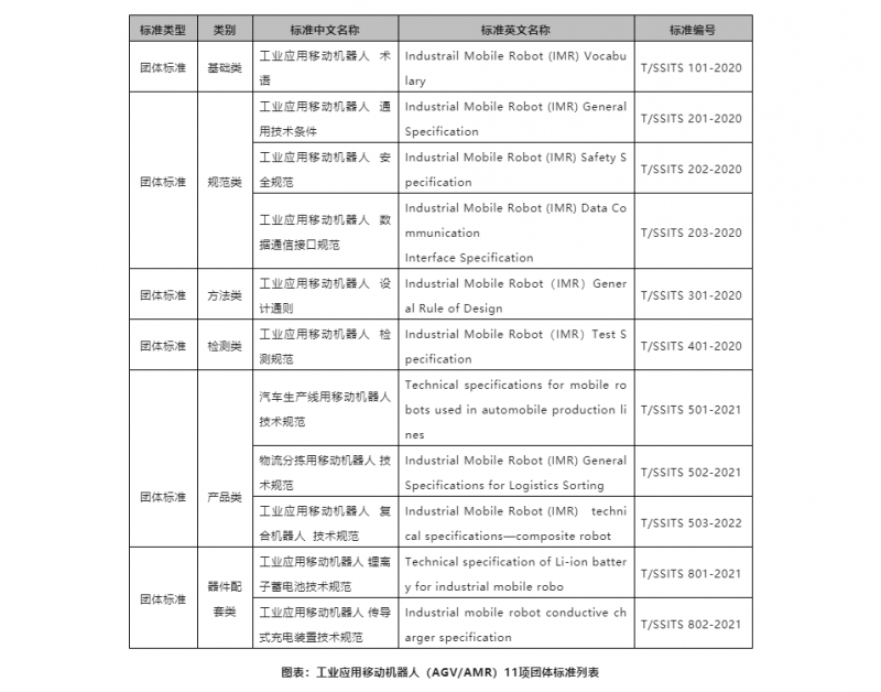 CMR產業聯盟自成立以來一直致力于推動行業的規范化發展,截至目前,聯盟已經制定了11項團體標準,2022年,聯盟還將制定《工業應用移動機器人 無人叉車技術規范》、《工業應用移動機器人 箱式倉儲機器人技術規范》、《工業應用移動機器人與其調度系統數據接口規范》三項團體標準。