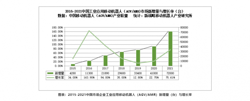 根據中國移動機器人(AGV/AMR)產業聯盟數據、新戰略移動機器人產業研究所統計,2021年度,中國市場企業整體銷售工業應用移動機器人(AGV/AMR)72000臺,較2020年增長75.61%,市場銷售額達到126億元(海外銷售25億元),同比增長64%。其中營收超億元的企業達到36家,同比增長50%。