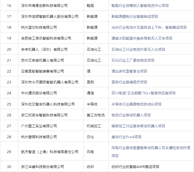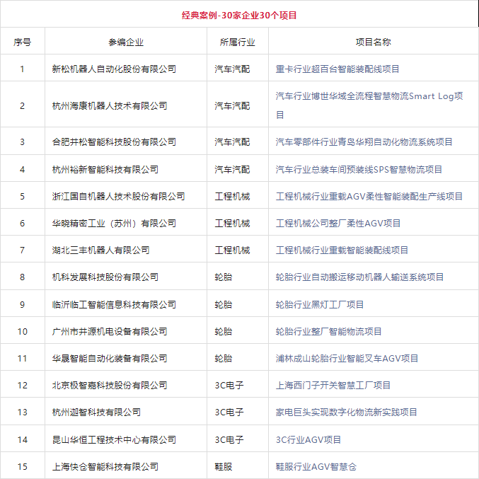 該合集甄選了30家企業(yè)30個經(jīng)典案例,涵蓋了汽車汽配、工程機械、第三方物流、3C電子、醫(yī)藥醫(yī)療等眾多行業(yè),無論是產(chǎn)品的創(chuàng)新度還是技術(shù)實力都有較高的代表性,是中國工業(yè)應(yīng)用移動機器人經(jīng)典之作,具體入選案例名錄如下: