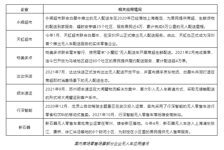 而商超配送方面,由于線下市場仍是主力,目前多以合作探索為主。如白犀牛與永輝超市、天虹超市,毫末智行與物美多點(diǎn)等,這些企業(yè)已經(jīng)在部分地區(qū)實(shí)現(xiàn)了常態(tài)化運(yùn)營。